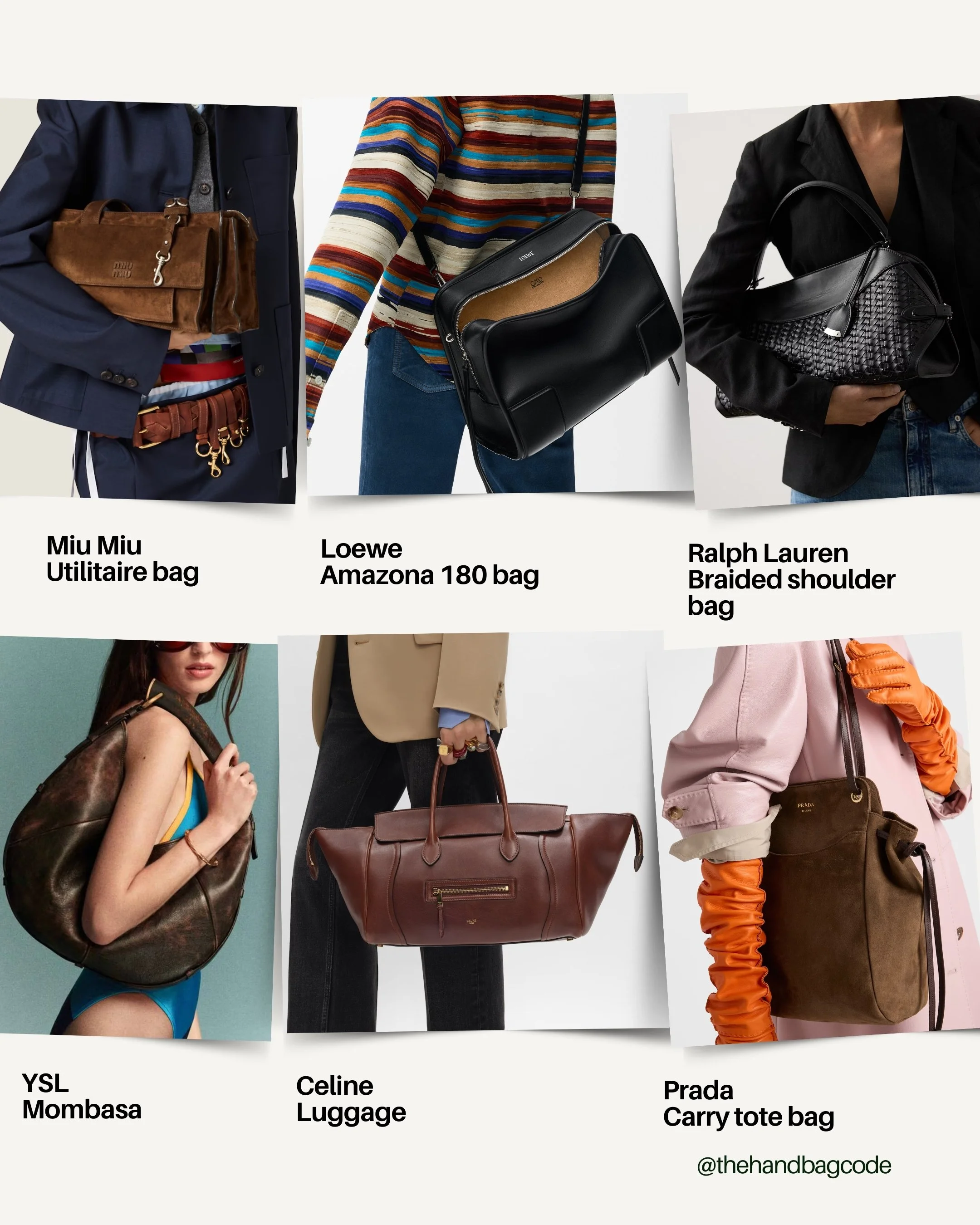 You see this in shoulder bags like the Loewe Amazona 180, the return of the YSL Mombasa, and even in more classic formats like the Celine Luggage when styled this way.